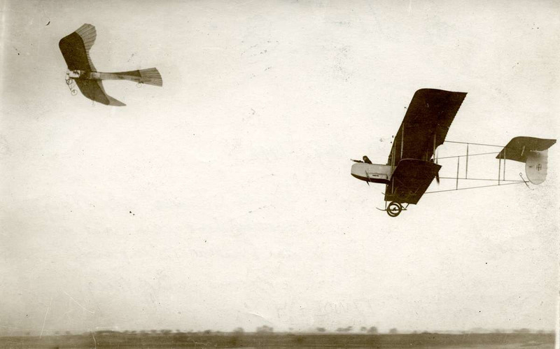 Французский самолет с пулемётом гонится за немецким планером Таубе. Франция, 1914 год.