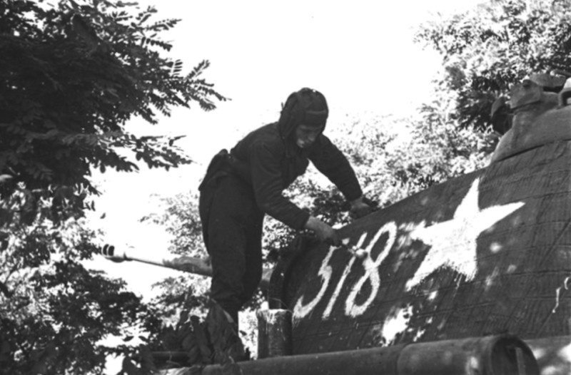 Советский танкист наносит опознавательные знаки и номер на трофейный немецкий танк Pz.Kpfw.V Ausf.A «Пантера»